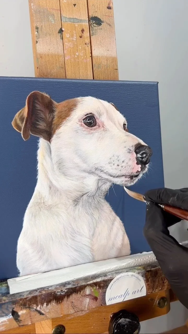 "My daughter Natalie recently lost her dog Alfie. As a result of this I commissioned a painting of Alfie from Jodie. Jodie was the most professional, compassionate person that made the process of painting Alfie flawless, keeping me informed with regular updates and expected completion time. The painting was completed and dispatched arriving in a beautiful box with a hand written personal note from Jodie. As for the painting it was nothing short of magnificent, so life like with amazing detail that brought tears to Natalie’s eyes. I could not think of a better way to remember our special friend Alfie painted by a very special talented person Jodie. I would have no hesitation recommending Jodie to any of my family or friends"