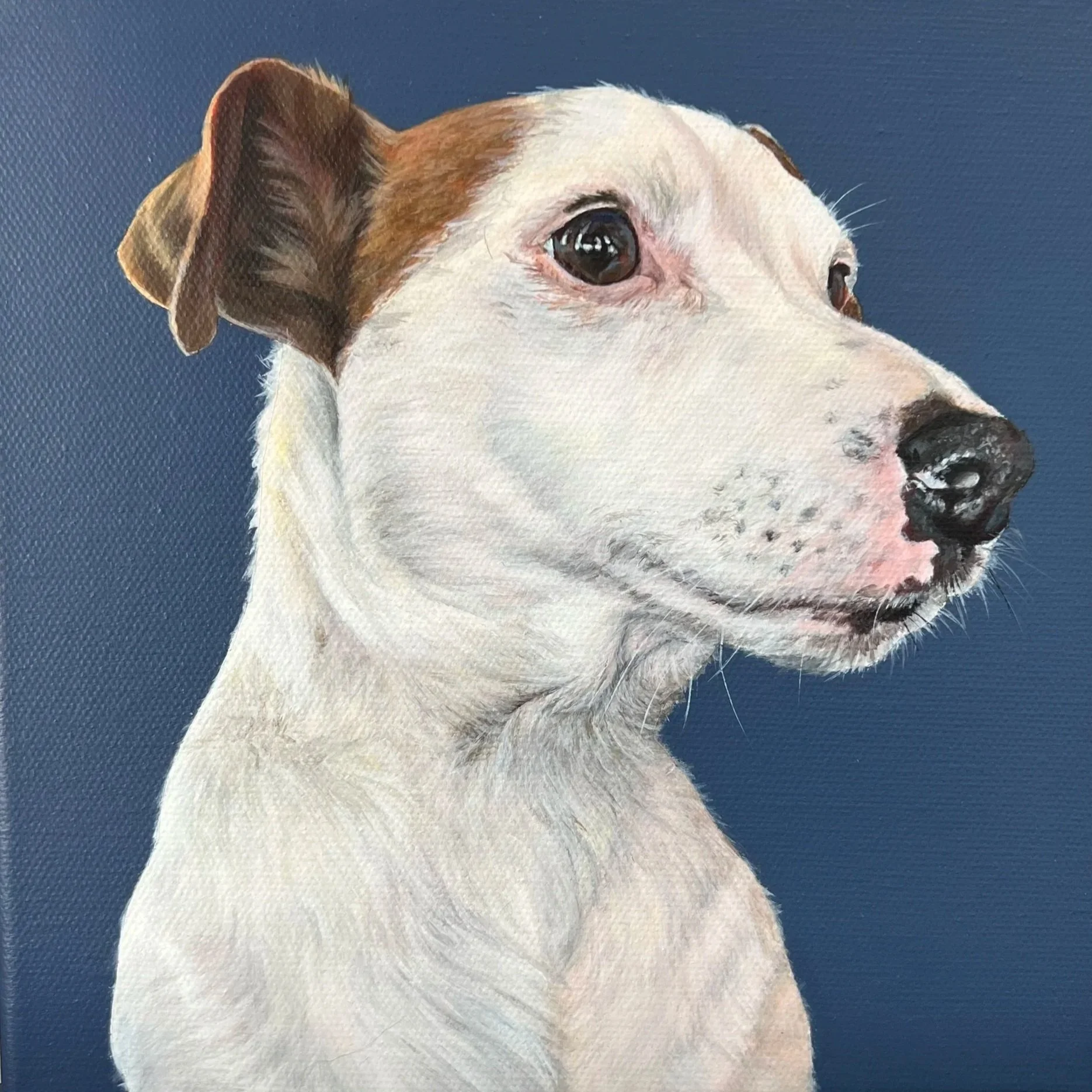 “Can’t thank Jodie enough for painting a portrait of our dog Fred. From our first contact with Jodie everything went smoothly, she kept in touch during her work to make sure we were happy with everything. The packaging of the painting was so secure and it arrived in perfect condition. This is our second commissioned painting from Jodie and I can’t express enough how perfect, detailed and life like both of our dog portraits are. Thank you so much.”